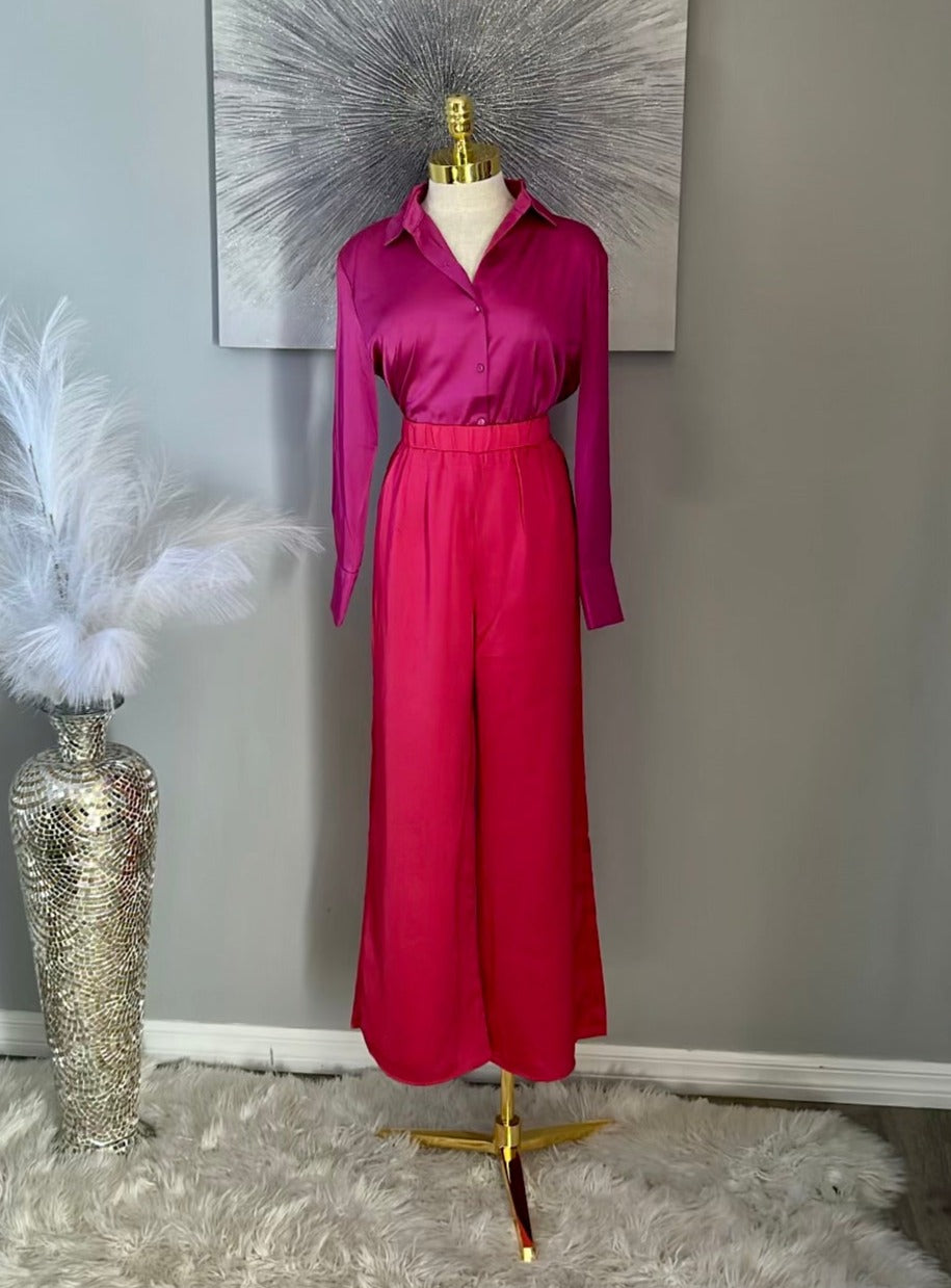 FUSCHIA PINK SATIN WIDE PANTS.
